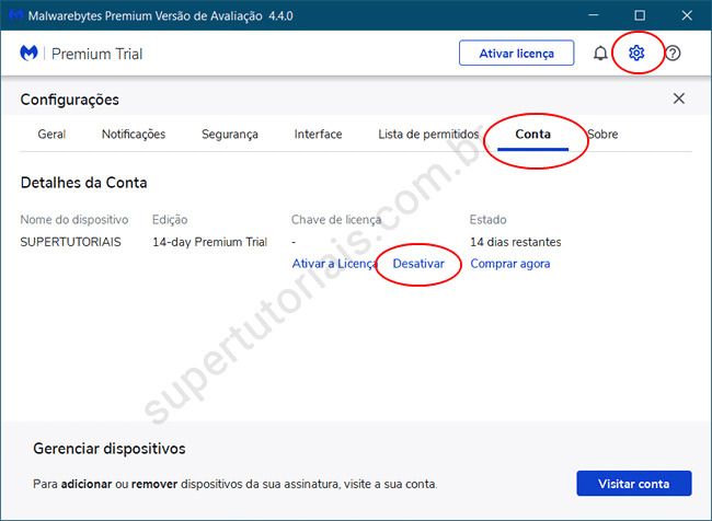 4. Por padrão, você irá usar a versão de avaliação por 14 dias, com todos os recursos disponíveis, entretanto, o mais recomendável e convertê-lo na versão gratuita desde o primeiro uso. Para isso, clique na “engrenagem”, abra a guia “Conta” e clique em “Desativar” para utilizar a versão gratuita.