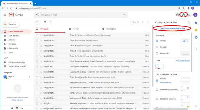 1. Para começar, acesse a sua conta do Gmail, clique no ícone de engrenagem (Configurações) do lado direito superior, e clique em “Ver todas as configurações” para abrir a página de configuração.