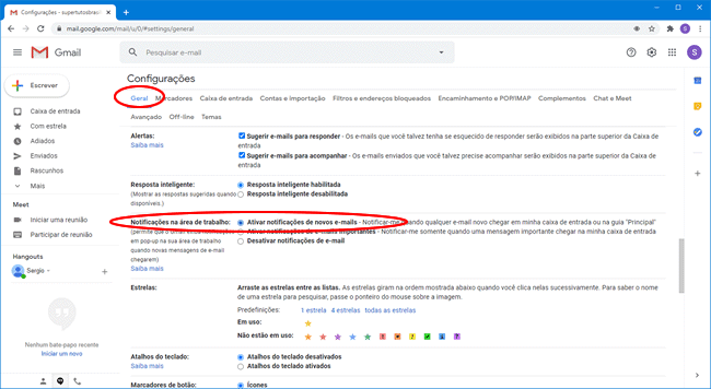 2. Na guia Geral, role a página até localizar a seção “Notificações na área de trabalho” e marque a opção “Ativar notificações de novos e-mails” para ele exibir notificações para os e-mails recebidos.