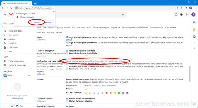 3. Em seguida, clique em “Clique aqui para ativar as notificações na área de trabalho para o Gmail” e uma janela pop-up de notificação será exibida. Clique em “Permitir” para habilitar as notificações.