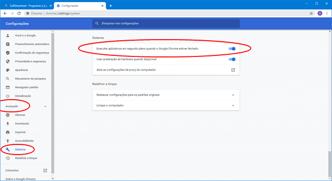 2. No menu lateral, clique na opção “Avançado > Sistema” e marque a opção “Executar aplicativos em segundo plano quando o Google Chrome estiver fechado”, caso ela ainda não esteja marcada.