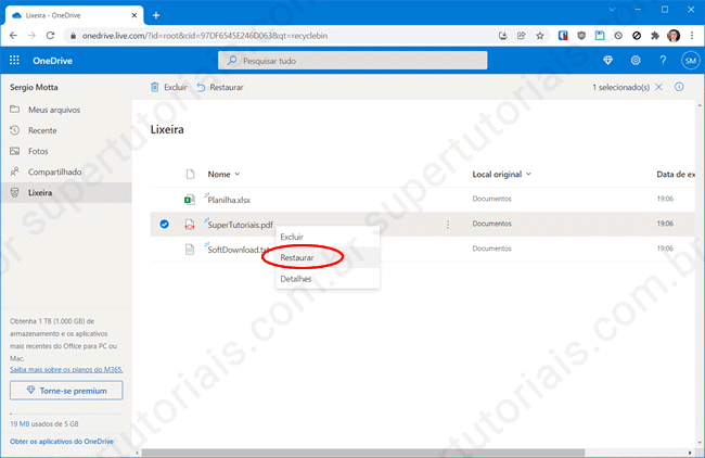 Quando você exclui um arquivo ou pasta de sua conta no OneDrive, ele é enviado pela lixeira, e você pode restaurá-los da lixeira em até 30 dias. Após esse prazo, o arquivo é excluído permanentemente.