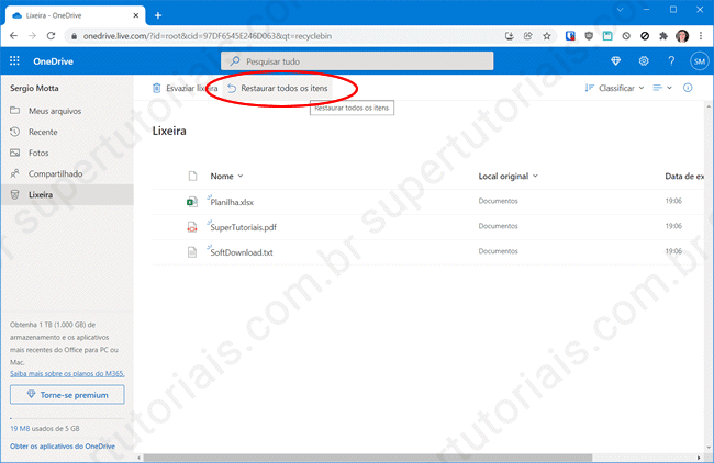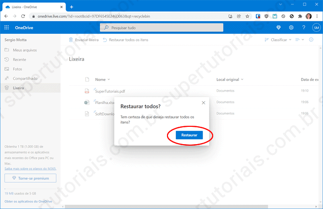4. Ao clicar na opção “Restaurar todos os itens”, uma mensagem de confirmação será exibida na tela, clique no botão “Restaurar” para salvar todos os arquivos/pastas da lixeira em sua conta no OneDrive.