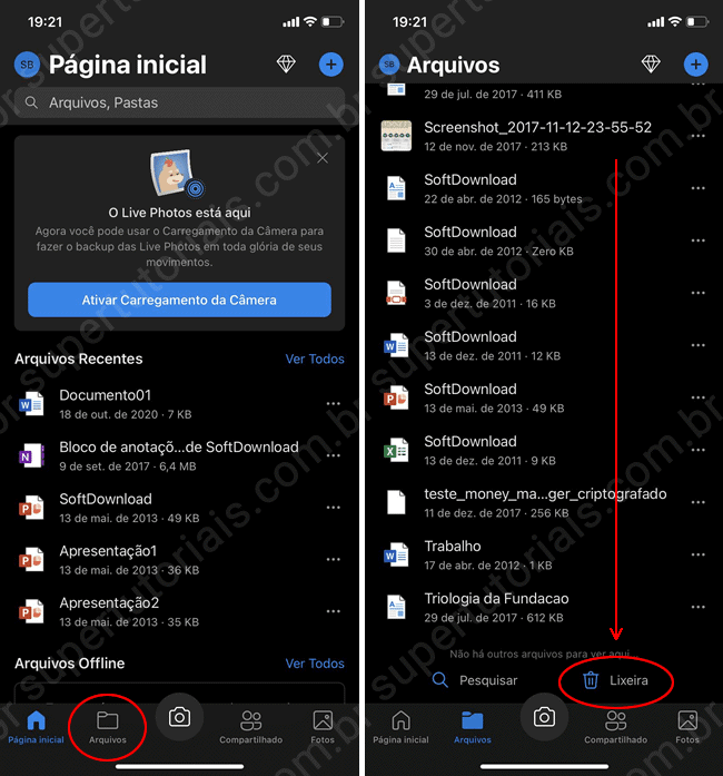 1. Abra o aplicativo do OneDrive em seu smartphone Android ou iOS, toque na opção “Arquivos” na parte inferior da tela e, em seguida, toque em “Lixeira”, localizada na parte inferior da lista de pastas.