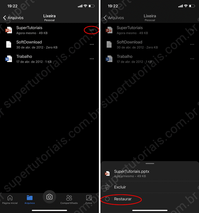 2. Uma vez na lixeira, localize o arquivo ou pasta que deseja restaurar, toque nos três pontos à direita do item e por último, selecione a opção “Restaurar” no menu que será exibido na parte inferior da tela.