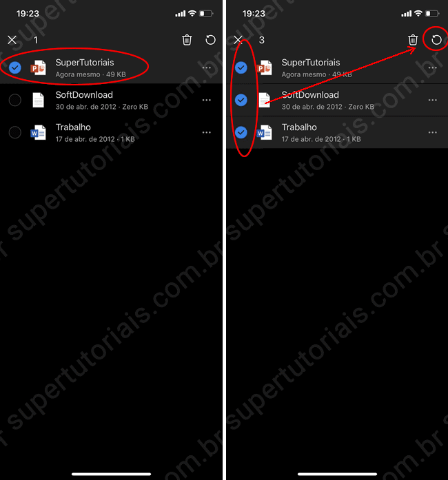 3. Para selecionar vários arquivos e/ou pastas de uma única vez, toque e segure o primeiro arquivo e selecione os outros arquivos tocando neles. Uma marca de seleção azul será exibida à esquerda dos arquivos marcados. Por último toque em “Restaurar” no canto superior da tela para restaurar os itens.