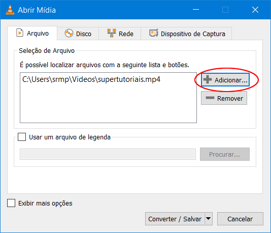 3. Na guia “Arquivo” clique no botão (+ Adicionar) e selecione o vídeo que deseja remover o áudio e uma vez adicionado o vídeo, clique no botão “Converter/Salvar” para dar continuidade no processo.