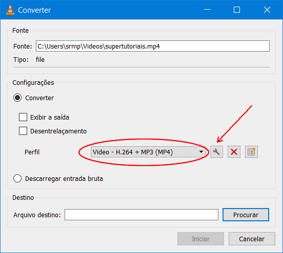 4. Na seção “Perfil”, selecione um perfil (se não houver nenhum selecionado), como por exemplo, o “Vídeo H.264 + MP3 (MP4)” e, em seguida, clique no botão com ícone de chave de boca.