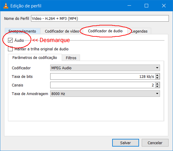 5. Abra a guia “Codificador de áudio”, desmarque a caixa “Áudio” e clique em “Salvar”.