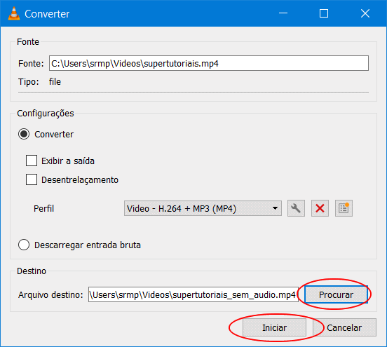 6. Clique em “Procurar” no campo “Arquivo de Destino”, selecione aonde deseja salvar o vídeo sem áudio e dê um nome para o arquivo. Por fim clique no botão “Iniciar” para remover o áudio do vídeo.