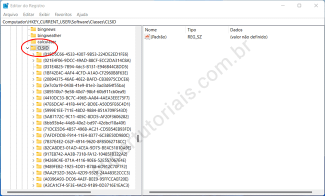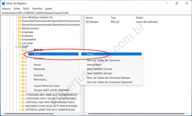 3. Verifique se uma chave com o nome {86ca1aa0-34aa-4e8b-a509-50c905bae2a2} existe. Caso ela não exista você precisará criá-la. Clique com o botão direto em “CLSID” e selecione “Novo > Chave”.