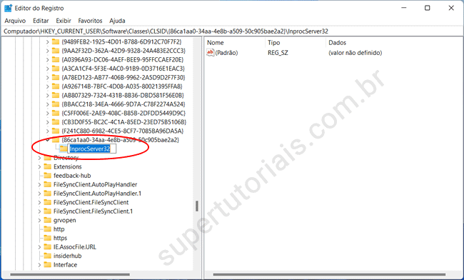 5. Clique com o botão direito na chave {86ca1aa0-34aa-4e8b-a509-50c905bae2a2} que acabou de criar, selecione a opção “Novo > Chave” e nomeie a chave como InprocServer32.