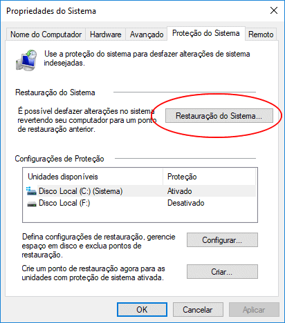 2. Na janela aberta, clique em “Restauração do sistema”.