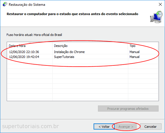 4. Selecione o ponto de restauração que deseja usar e clique em “Avançar”. Os pontos são exibidos com data de criação. Use a informação para escolher um ponto com data anterior as alterações que você fez. Você também pode ver os programas afetados clicando em “Procurar programas afetados”.