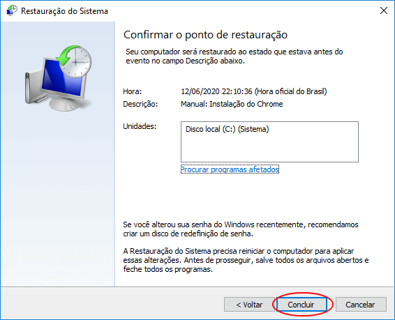 5. Clique em “Concluir” e o Windows 10 será restaurando para a data do ponto de restauração.