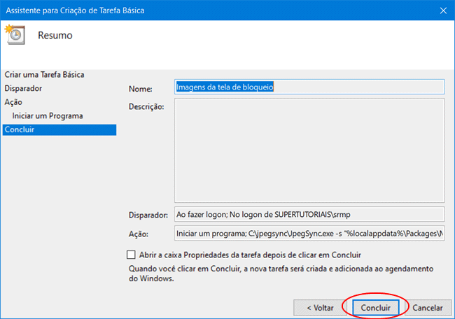 10. Por último, basta clicar em “Concluir” e o programa será executado automaticamente sempre que você fizer logon na sua conta de usuário do Windows 10 e irá baixar as imagens da tela de bloqueio.