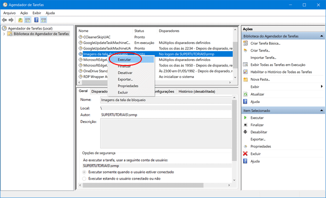 11. Para você testar se a tarefa está funcionando, clique em “Biblioteca do Agendador de tarefas” do lado esquerdo, encontre a tarefa criada no painel central, clique com o botão direito nela e selecione “Executar”. Aguarde alguns segundos, abra a pasta C:\jpegsync\ e veja se as imagens foram salvas.