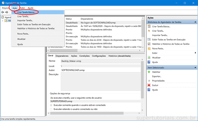 4. No Agendador de Tarefas, clique em “Ação > Criar Tarefa Básica”.