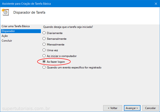 6. Na tela seguinte, marque a opção “Ao fazer logon” e clique em “Avançar”.