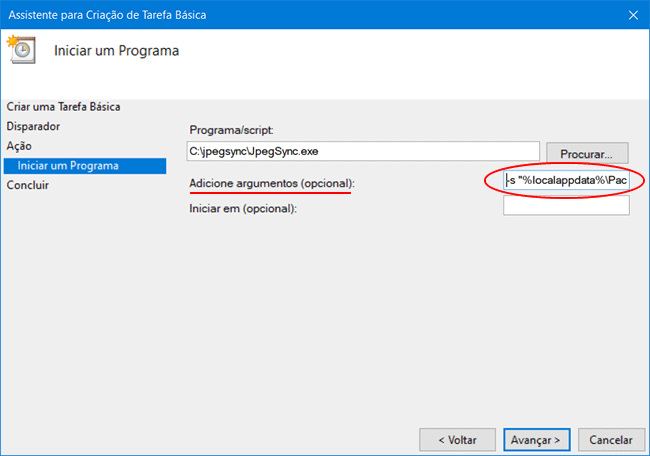 9. Copie o código abaixo e cole no campo “Adicione Argumento (Opcional) e clique em “Avançar”. As imagens da tela de bloqueio serão salvas na pasta Imagens da sua conta de usuário no Windows 10.