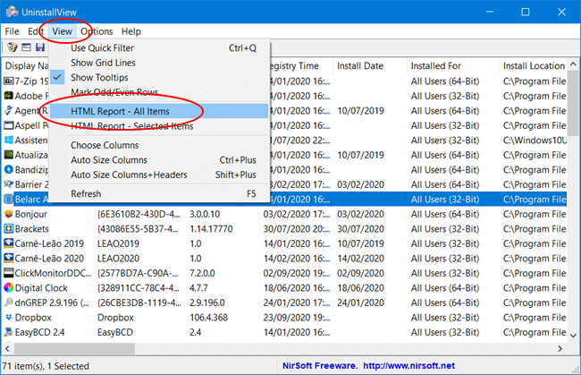 2. Uma vez executado, ele listará todos os programas instalados em seu computador. Para salvar a lista de programas instalados, clique no menu “View” e selecione a opção “HTML Report-All items”.