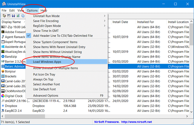3. Se você quiser incluir na lista os aplicativos do Windows 10 instalados, clique no menu “Options” e marque a opção “Load Windows Apps” para recarregar a lista com os aplicativos do Windows 10.
