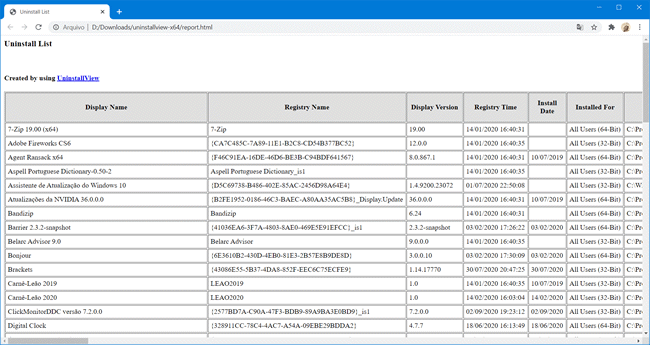 4. A lista de programas instalados no computador será aberta automaticamente em seu navegador padrão com informações como nome, versão, data de instalação, pasta de instalação, entre outros.