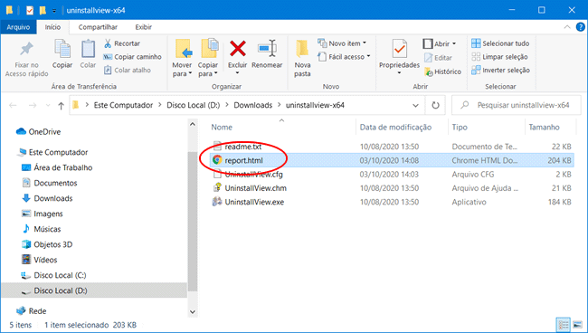 5. O arquivo HTML com a listagem de programas instalados em seu computador será salvo dentro da pasta onde está o Uninstall View, com o nome report.html. Guarde esse arquivo para ver a lista.
