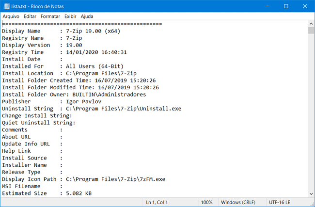 7. Ele irá gerar a lista de programas instalados com diversas informações, como nome, versão, data de instalação, pasta de instalação, tamanho, atributos, editor, chave de registro, e assim por diante.