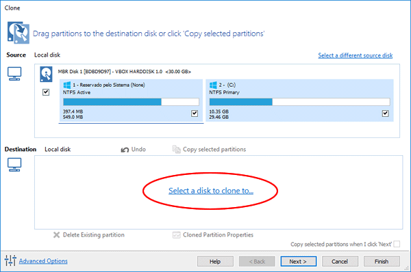 4. Na tela seguinte você precisará selecionar para qual disco deseja clonar o HD selecionado. Clique em “Select a disk to clone to” e selecione o disco rígido novo que você conectou em seu computador.