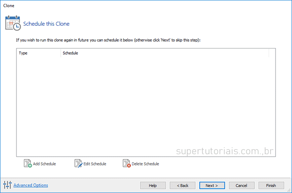 5. Clique no botão “Next” para continuar e ele irá oferecer a opção de agendar a clonagem para ser realizada em em outro horário. Como queremos executá-la agora, clique me “Next” para continuar.