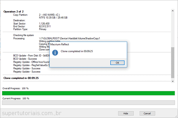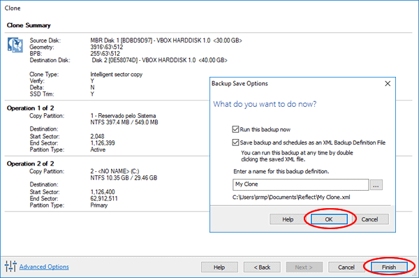 6. Por fim, ele irá exibir um resumo. Clique em “Finish” e depois em OK para iniciar a clonagem.