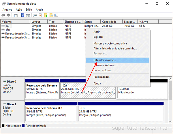 2. Clique com o botão direito no “Disco” com espaço não alocado e selecione “Estender Volume…”.