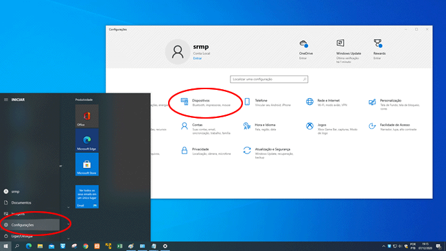 2. Mantenha essa janela aberta e no Windows 10, abra o menu Iniciar, clique em “Configurações” e escolha a opção “Dispositivos”. A janela deve ser aberta na seção “Bluetooth e outros dispositivos”.