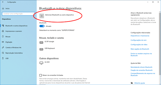 3. Clique no botão (+ Adicionar Bluetooth ou outro dispositivo).