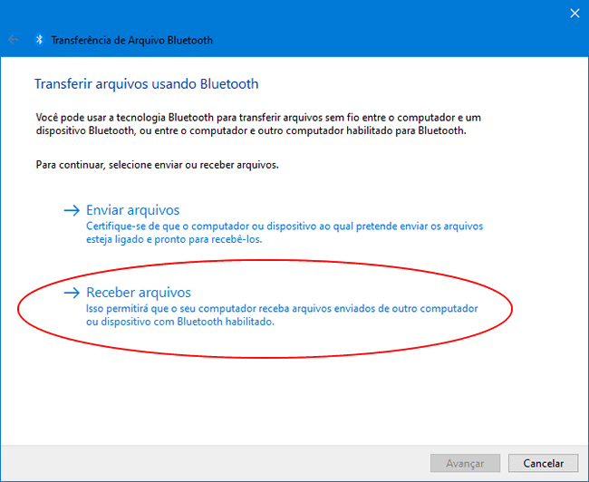 1. No computador, clique na opção “Enviar ou receber arquivos via Bluetooth”.