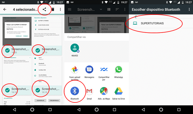 3. No smartphone, selecione os arquivos que deseja enviar para o Windows 10, toque na opção de compartilhamento, escolha o “Bluetooth” e por fim, selecione o computador na lista de dispositivos.