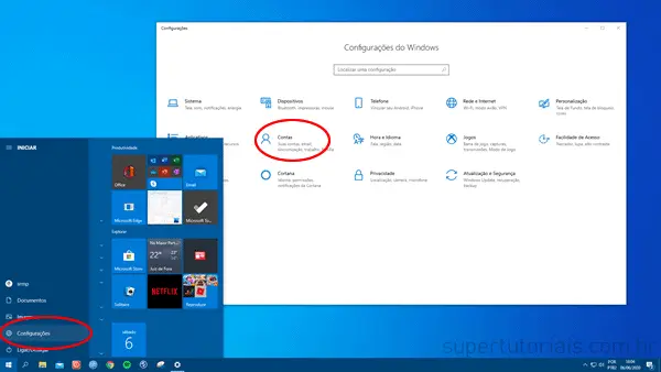 1. Para começar, clique em “Iniciar > Configurações > Contas”