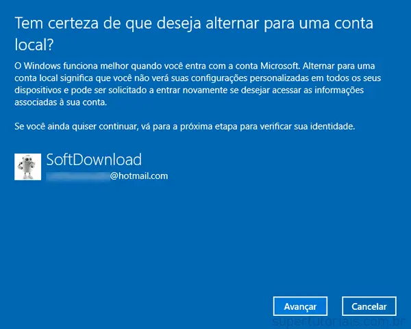 3. Em seguida, será exibida uma tela de confirmação perguntado se você deseja realmente alternar da conta Microsoft para a conta local. Clique no botão “Avançar” para dar continuidade no processo.