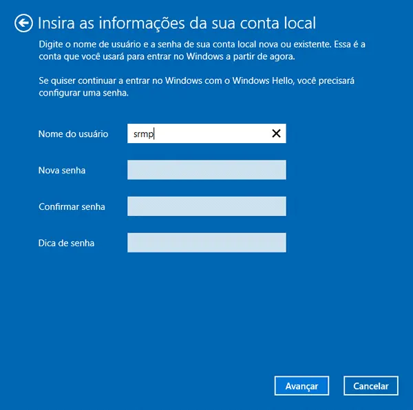 5. Agora defina o nome do usuário e crie uma senha para conta local.