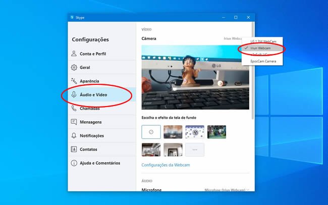 4. Agora basta configurar a webcam do Iriun no aplicativo desejado. Por exemplo no Skype, abra as configurações do Skype, clique na opção “Áudio e Vídeo” selecione a “Iriun Webcam” em “Câmera”.