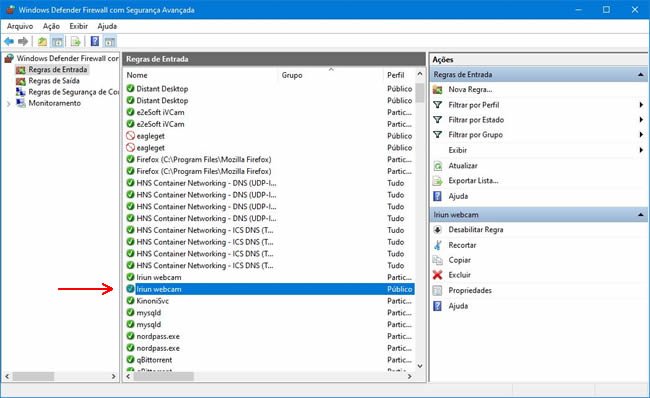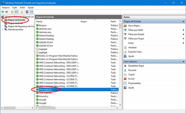 3. Clique em “Regras de Entrada”, localize o “iriun webcam” na lista e clique duas vezes sobre ele.