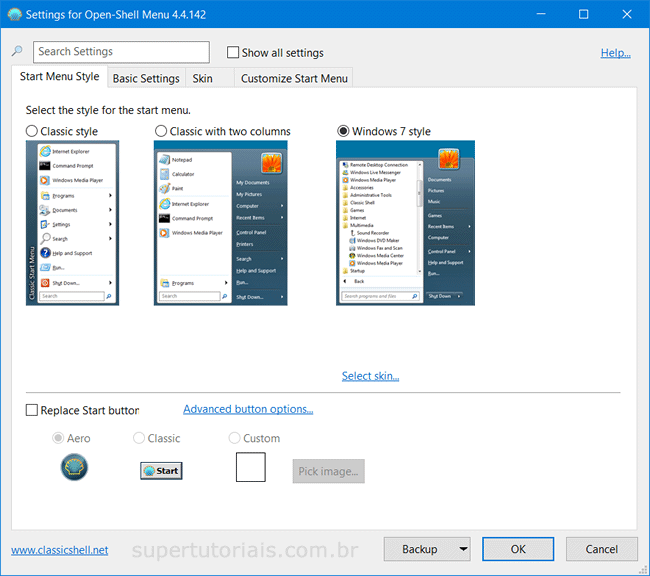 4. Além disso, na opçao “Skin” você pode escolher a interface do Menu Iniciar. Por exemplo, se você selecionar o skin do tipo Windows Aero, o visual do Menu Iniciar ficará semelhante ao do Windows 7.