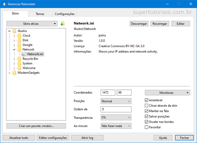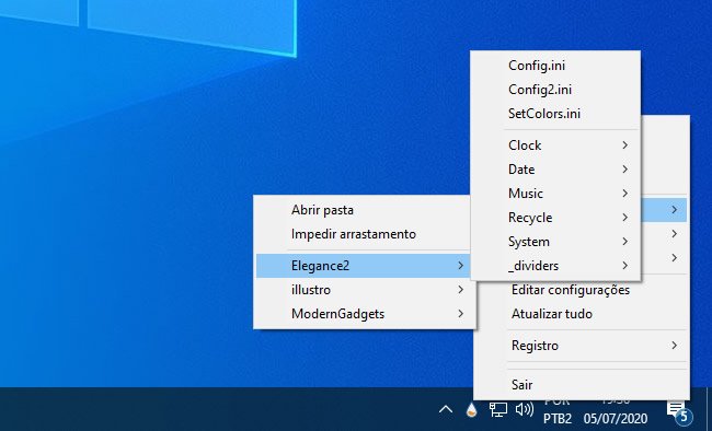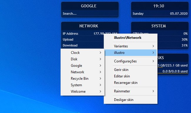 3. Agora basta clicar com o botão direito no ícone do RainMeter na bandeja do sistema, selecionar a opção “Skins”, encontrar o pacote instalado e habilitar os skins que deseja exibir na área de trabalho.