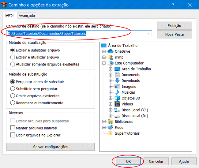 7. Ao clicar em “Extrair para”, selecione a pasta onde deseja extrair os arquivos e clique em “OK”.
