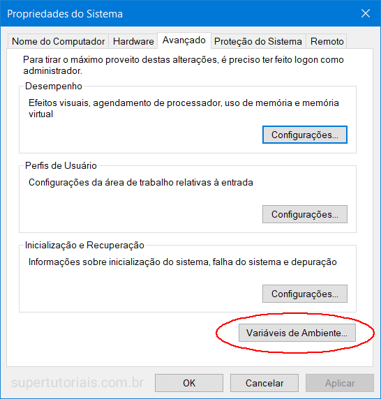 3. Na guia “Avançado” , clique em “Variáveis de Ambiente…”.