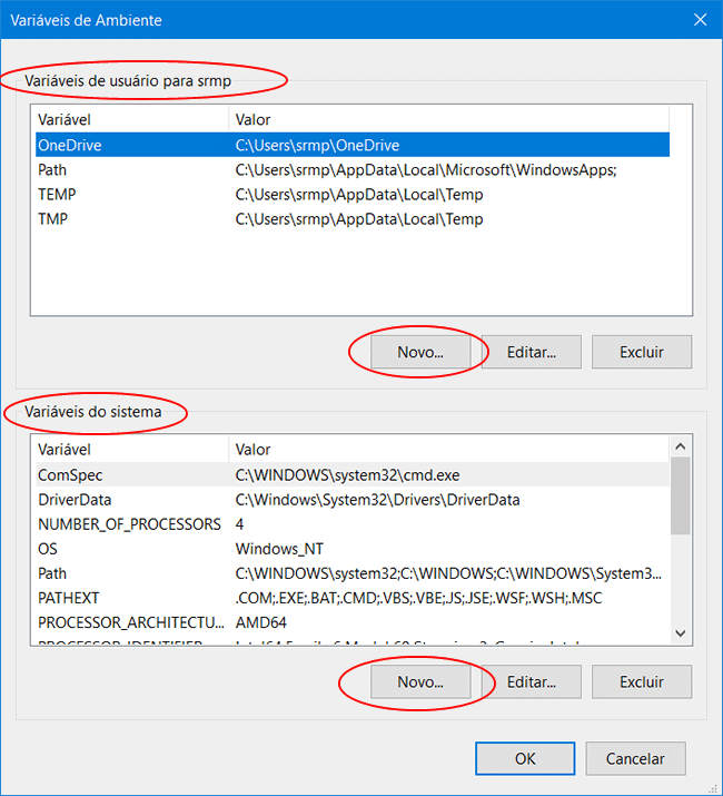 1. Siga os três primeiros passos acima e na janela de variáveis de ambiente, clique no botão “Novo” da variável de usuário ou do sistema. Nesse exemplo abaixo, vamos criar uma variável do sistema.