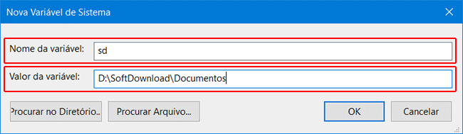 2. Na janela aberta, digite o nome da variável (que será o que você precisará digitar para acessar a pasta/arquivo) e, em “Valor da variável”, adicione o caminho da pasta ou programa que deseja abrir.