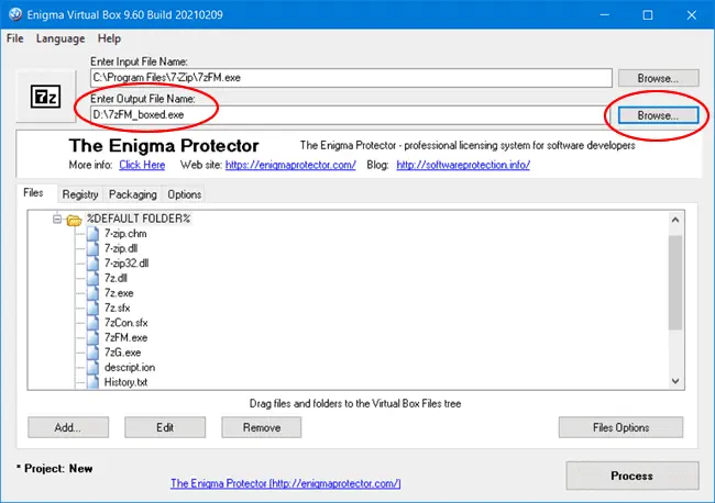 5. Por último, o Engima Virtual Box preencherá automaticamente o campo “Enter Output FIle Name” com o nome do programa convertido em portátil. Para salvar a versão portátil do programa em outra pasta, clique no botão “Browse” do campo “Enter Output File Name” e selecione a pasta desejada.