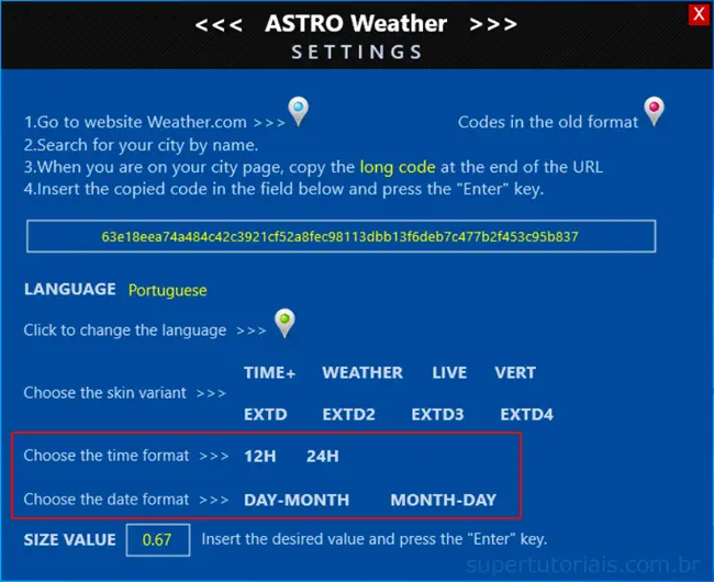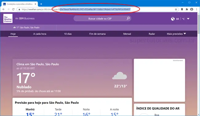 6. Na janela de configuração do AstroWeather, a primeira coisa que você precisa fazer é adicionar a cidade que deseja ver a previsão. Acesse o site www.weather.com, pesquise e carregue sua cidade. e copie o “código” exibido na barra de endereços logo após “https://weather.com/pt-BR/clima/hoje/l”.
